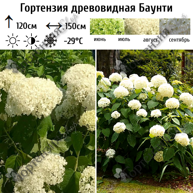 Гортензия древовидная (Hydrangea arborescens) 'Баунти' - Компактный сорт с шаровидной формой кроны высотой не более 1,2–1,4 м и до 1,5 м в диаметре. Соцветия пышные, шаровидные, до 25–30 см в диаметре, состоят из крупных 4-лепестковых стерильных цветков, плотно прижатых друг к другу. При распускании цветки имеют лёгкий зеленовато-белый оттенок, а в полном роспуске ослепительно-белые.