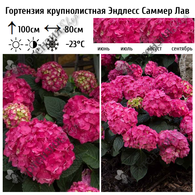 Куст компактный, густой, к 10-ти годам высотой 100 см и диаметром 70 см. Цветки от малиново-красных до фиолетовых, в шаровидных соцветиях. Цветение обильное, длительное, в июне-сентябре.  Цветёт на прошлогодних побегах и побегах текущего года. Побеги прочные, толстые, рубиново-красные. Место солнечное. Почва влажная, дренированная, слабокислая. В сильнокислой почве цвет  изменится на пурпурно-синий. Идеально подходит для сада, террасы. Место солнечное или полутенистое. На зиму требует укрытия.  Сорт "Летняя любовь" (Summer Love) изобилует бутонами интенсивного малиново-красного или темно-фиолетового цвета  Гортензия обладает не только сказочной красотой, но и компактным внешним видом.