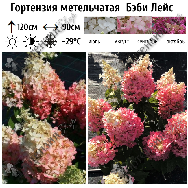 Цветки белые, осенью розовеют. Соцветия длиной до 15 см. Цветение с июля до заморозков. Куст компактный, высотой и шириной 90-120 см. Побеги сильные. Листья тёмно-зелёные. Цветение с июля по октябрь..
