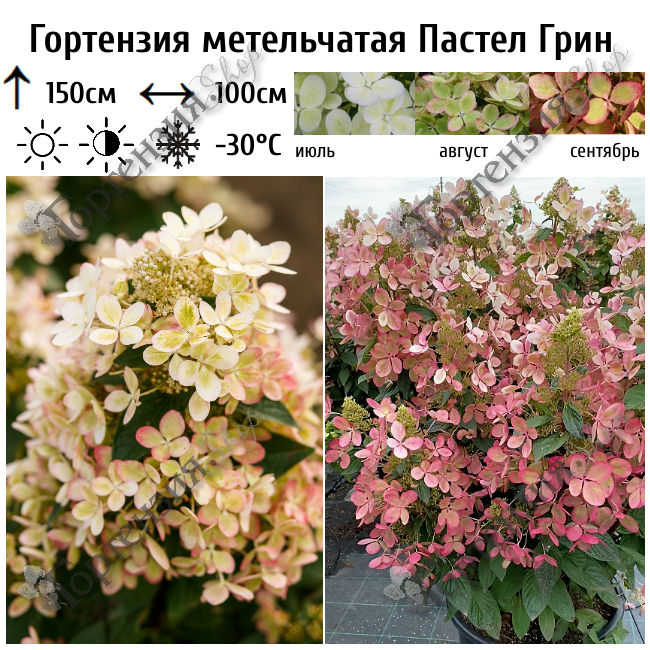 Размеры кустарника Пастел Грин (Pastel Green) компактные: его высота достигает 1,5 метра, а ширина около метра.Растение обладает большими и воздушными соцветиями. По виду их можно сравнить с «облаком» сладкой ваты, поскольку очень пышно цветет. Соцветия по форме напоминают конус, их длина может доходить до 20 сантиметров. Цветы имеют форму четырёхлистника, а листья похожи на капли и зеленого оттенка.У цветов первый цвет – это белый, затем он сменяется кремовыми оттенками, после происходит переход в зеленоватую палитру к фисташковым тонам. Далее цветы приобретают лососёвые цвета. После идет плавный переход в коралловые и розовые, а ближе к осени и завершению цветения происходит смена на винно-кровавые оттенки. Если верно выбрать время, можно застать сразу несколько оттенков на соцветиях, и тогда растение выглядит по-настоящему волшебно и завораживает своей красотой и уникальностью.