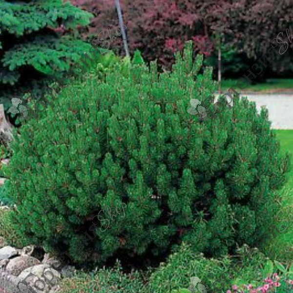 Сосна горная Мопс (Pinus mugo Mops) - карликовая закругленная форма, одинаковой ширины и высоты. Высота и ширина - 1.5 м. Побеги очень короткие. Почки расположены плотно, различной величины, 1 - 2 см длиной, тонкие, коричневые, смолистые. Крона шаровидная. Хвоя на молодых побегах почти прямая, 2 - 4,5 см длиной и до 2 мм шириной, темно-зеленая. Растет медленно и очень густо ветвится. Зимостойка.