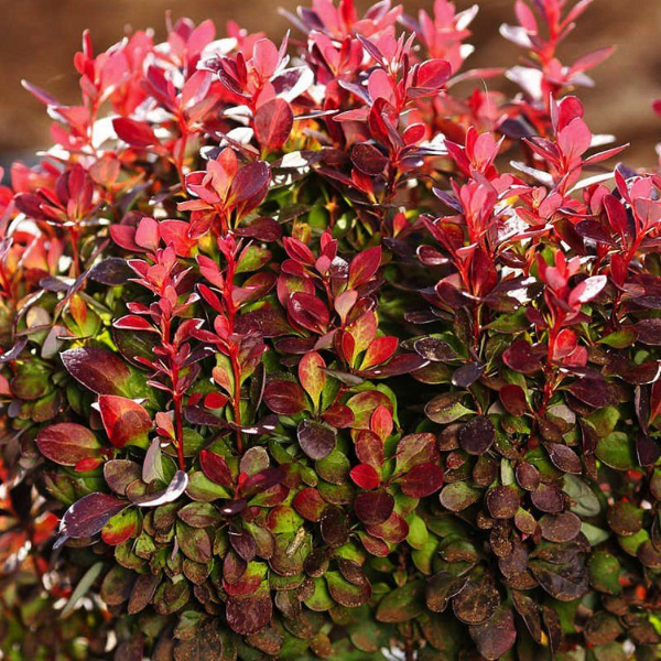 Барбарис Тунберга (Berberis thunbergii) Лютин Руж - среднерослый компактный кустарник с плотной кроной высотой до 120 см и диаметром около 90 см. Выделяется эффектной листвой - красной весной и летом и тёмно-бордовой осенью. Цветёт в июне жёлтыми цветочками. Барбарис Тунберга (Berberis thunbergii) Лютин Руж хорошо подходит в качестве живой изгороди и бордюра, в групповых и одиночных посадках.