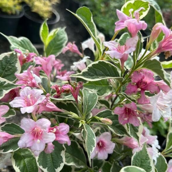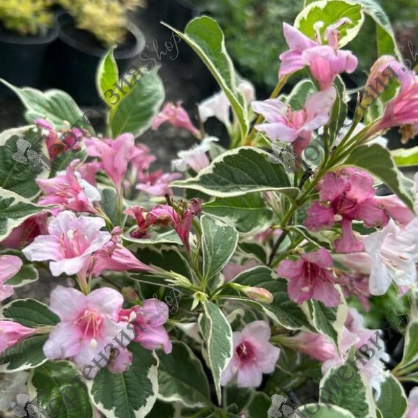 .Вейгела цветущая 'Санни Фэнтези' - красивоцветущий кустарник высотой до 1,5 м, и диаметром до 1,3 м. Зеленые листья по краям окаймлены желтым. Цветки вейгелы появляются в июне-июле, ярко-розовые с лавандовой каймой, 3-4 см. Вейгела отлично дополняет композиции из хвойных растений, хорошо смотрится в групповых и одиночных посадках.