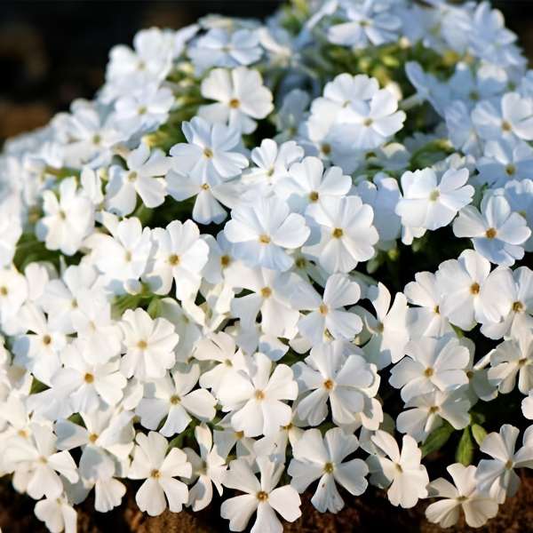 Флокс 'Вайт Делайт' (Phlox subulata 'White Delight') - Многолетнее растение, листья зеленые игольчатые, цветки белые, звездчатые с лёгкими голубоватыми тенями, является стелющимся сортом, образует вечнозелёные ковры. Разрастается хорошо. Период цветения длится с мая до июня. После цветения желательно сократить толщину дернинки на 5-8 см. Это позволит избежать израстания и оголения. Почвы предпочитает плодородные, дренированные. Используется в миксбордерах цветниках, рокарии и альпинарии.
