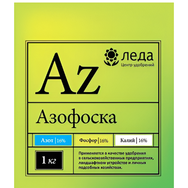 Азофоска Леда (нитроаммофоска) - это высокоэффективное водорастворимое комплексное удобрение, которое содержит азот (16%), фосфор (16%) и калий (16%).