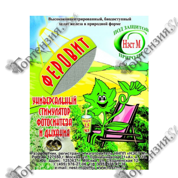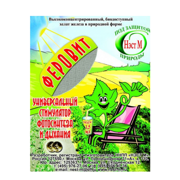 Феровит (универсальный стимулятор фотосинтеза) - высококонцентрированный питательный раствор хелата железа (содержание хелатного железа не менее 75 г/л, азота 40 г/л). Феровитпредназначен для корневых и внекорневых подкормок комнатных, декоративно-цветочных растений, овощных культур и плодово-ягодных деревьев и кустарников. Когда растению не хватает доступного железа, оно начинает страдать хлорозом - нарушается фотосинтез, не образуется хлорофилл, листья начинают желтеть, мельчать, преждевременно опадать. Это приводит к снижению урожайности, декоративности и даже гибели растения. Недостаток железа растения могут испытывать как на щелочных карбонатных почвах, так и на кислых в связи с сильной фиксацией его почвой. При поливе комнатных растений жесткой водой, почва защелачивается и железо становится недоступным для растений. Нормы расхода Некорневые подкормки профилактически проводят 0,03-0,1% раствором Феровита, а при появлении признаков хлороза – 1-2 раза в неделю до полного исчезновения хлороза 0,1-0,4%-ным раствором. Для корневого питания в защищенном грунте рекомендуется от 1 до 3 л препарата Феровита на 1 куб. м маточного раствора. Эта ориентировочная доза применения хелата железа, нуждающаяся в уточнении в зависимости от потребности растений.