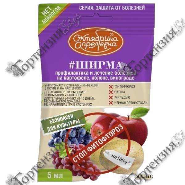 Ширма – Высокоэффективный контактный фунгицид, предназначенный для борьбы с фитофторозом картофеля, паршой яблони, милдью и черной пятнистостью виноградной лозы.